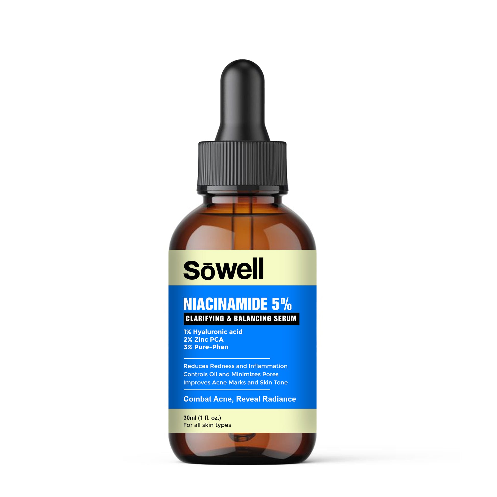 SOWELL Niacinamide 5% is a versatile and well-tolerated form of Vitamin B3, known for its numerous benefits in promoting healthier skin. A 5% concentration is ideal for improving skin texture, balancing oil production, and reducing the appearance of pores without causing irritation, making it suitable for most skin types.
