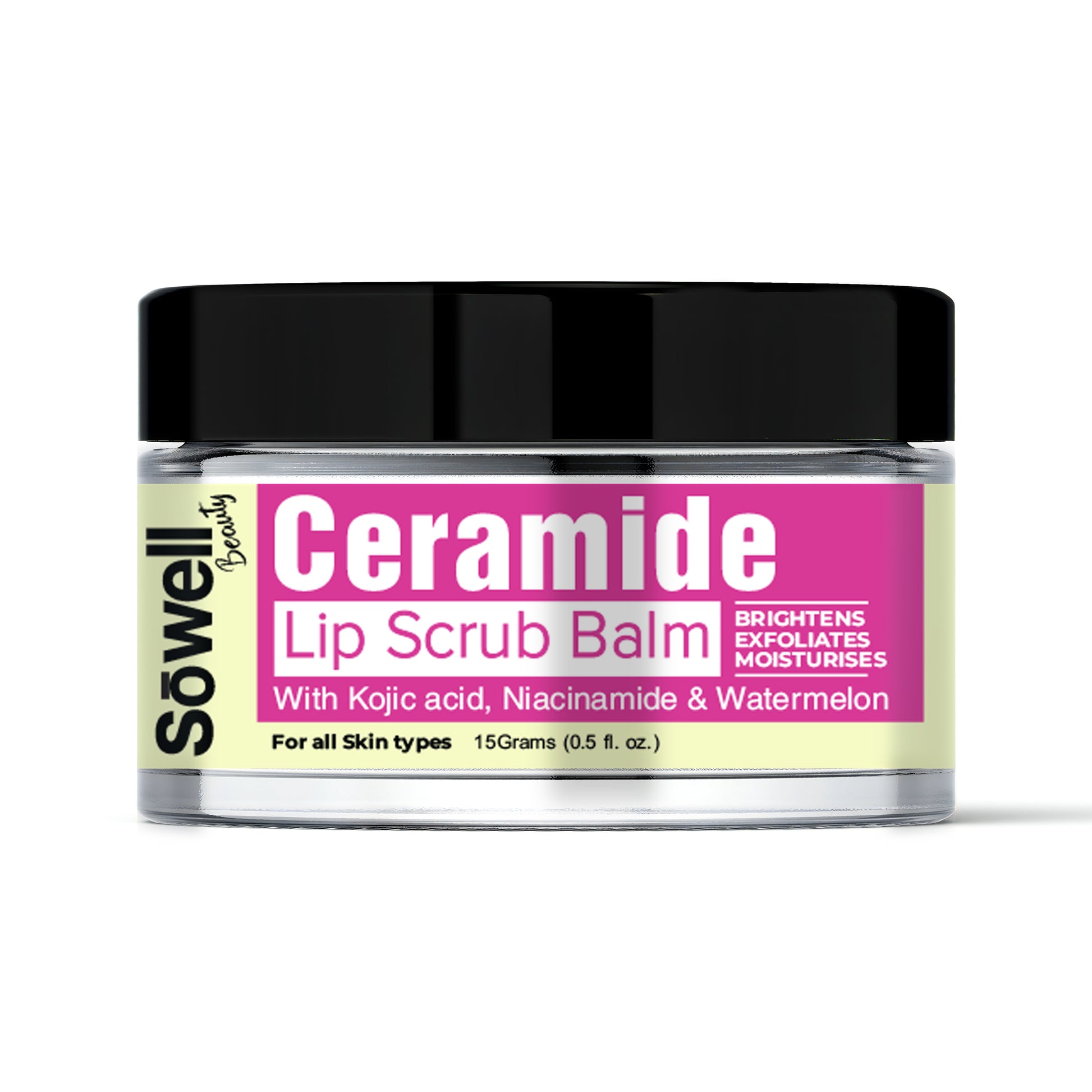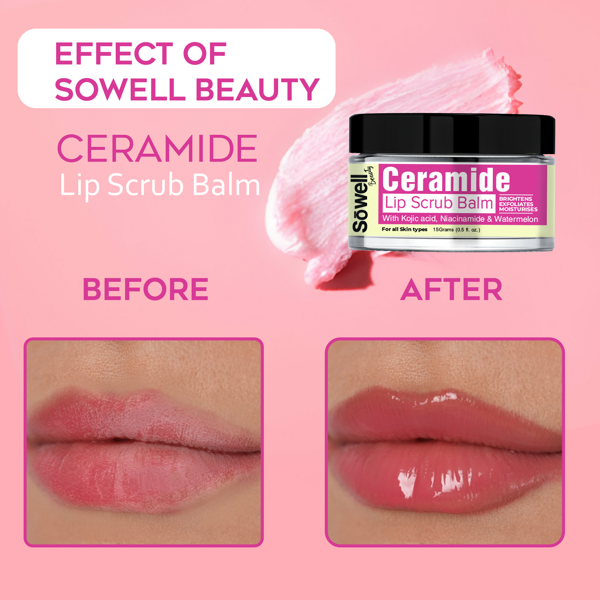 SOWELL BEAUTY Ceramide Lip Scrub Balm - a nourishing lip care product designed to exfoliate, hydrate, and rejuvenate your lips. With the power of ceramides, this balm helps maintain the skin's natural barrier, keeping lips moisturized and protected. Say goodbye to dry, flaky lips and hello to a smoother, healthier-looking pout.