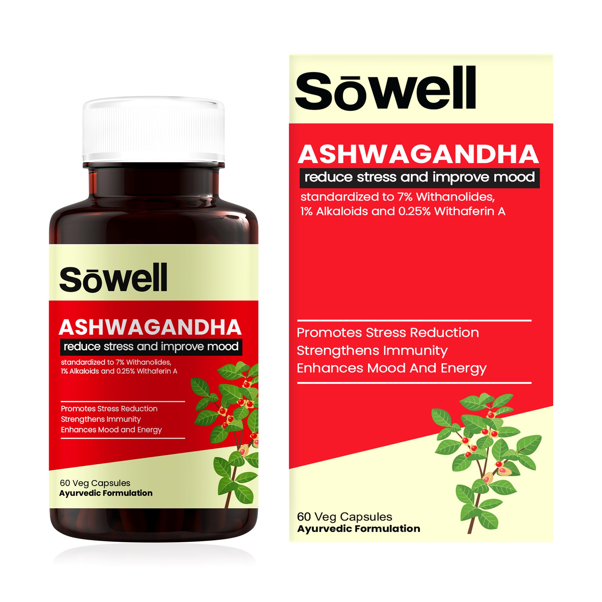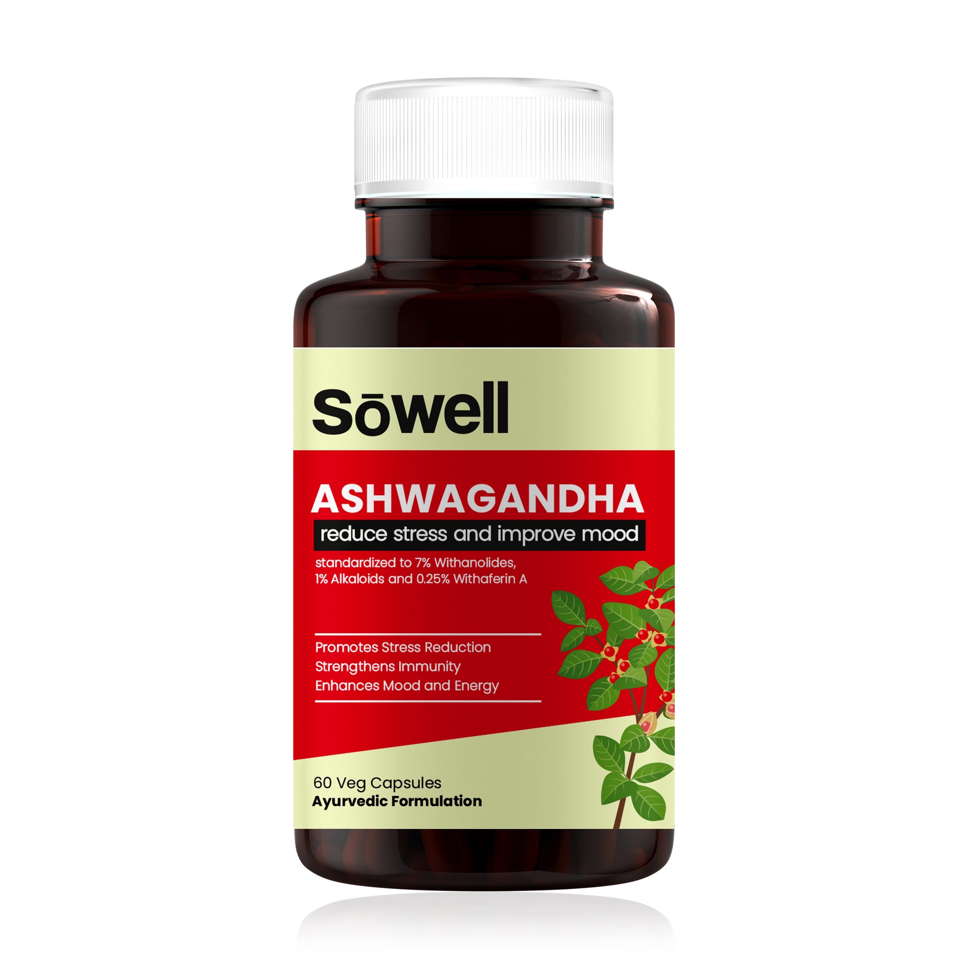 Sowell Health Ashwagandha Capsules offer a high-quality, standardized extract of ashwagandha, ensuring a potent and consistent dose of withanolides. Our formula is free from artificial additives and preservatives, providing a pure and natural supplement to support stress management, energy levels, and overall health. The supplement is available in vegetarian capsules, catering to a wide range of dietary preferences.