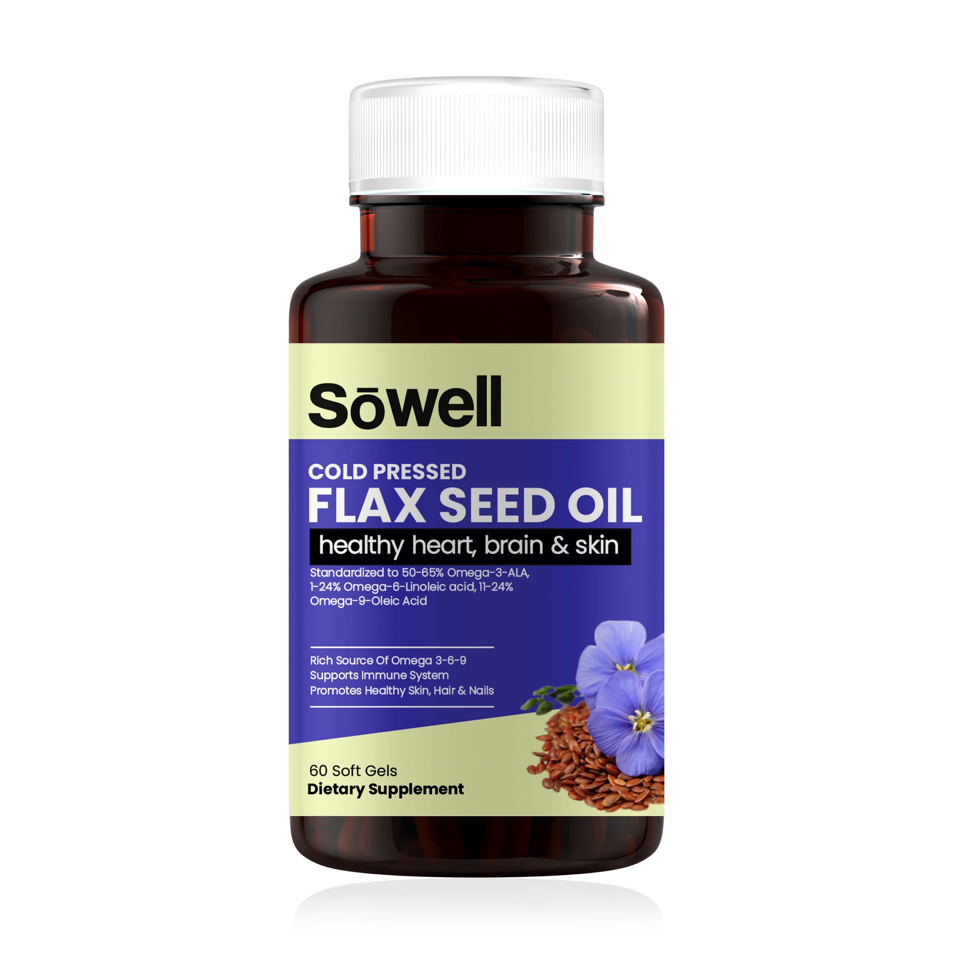 Sowell Health Cold Pressed Flax Seed Oil Softgels are carefully crafted using a cold-press extraction process, preserving the potency and purity of omega-3 fatty acids. Our softgels are free from artificial additives and preservatives, offering a pure and natural supplement. The high-quality gelatin capsules are designed for easy absorption, providing a convenient way to incorporate essential fatty acids into your diet.