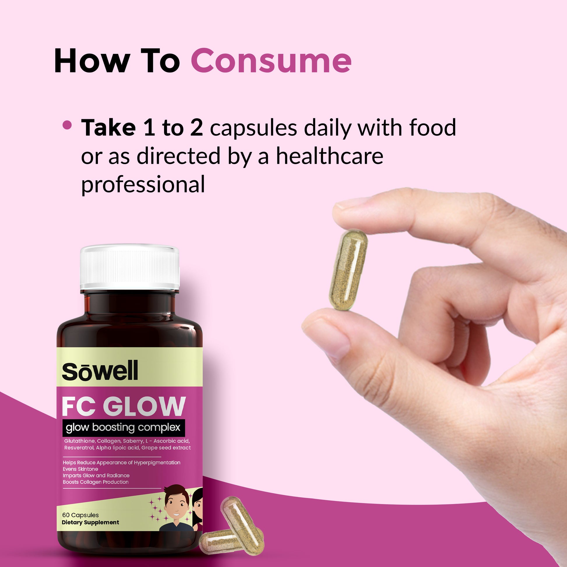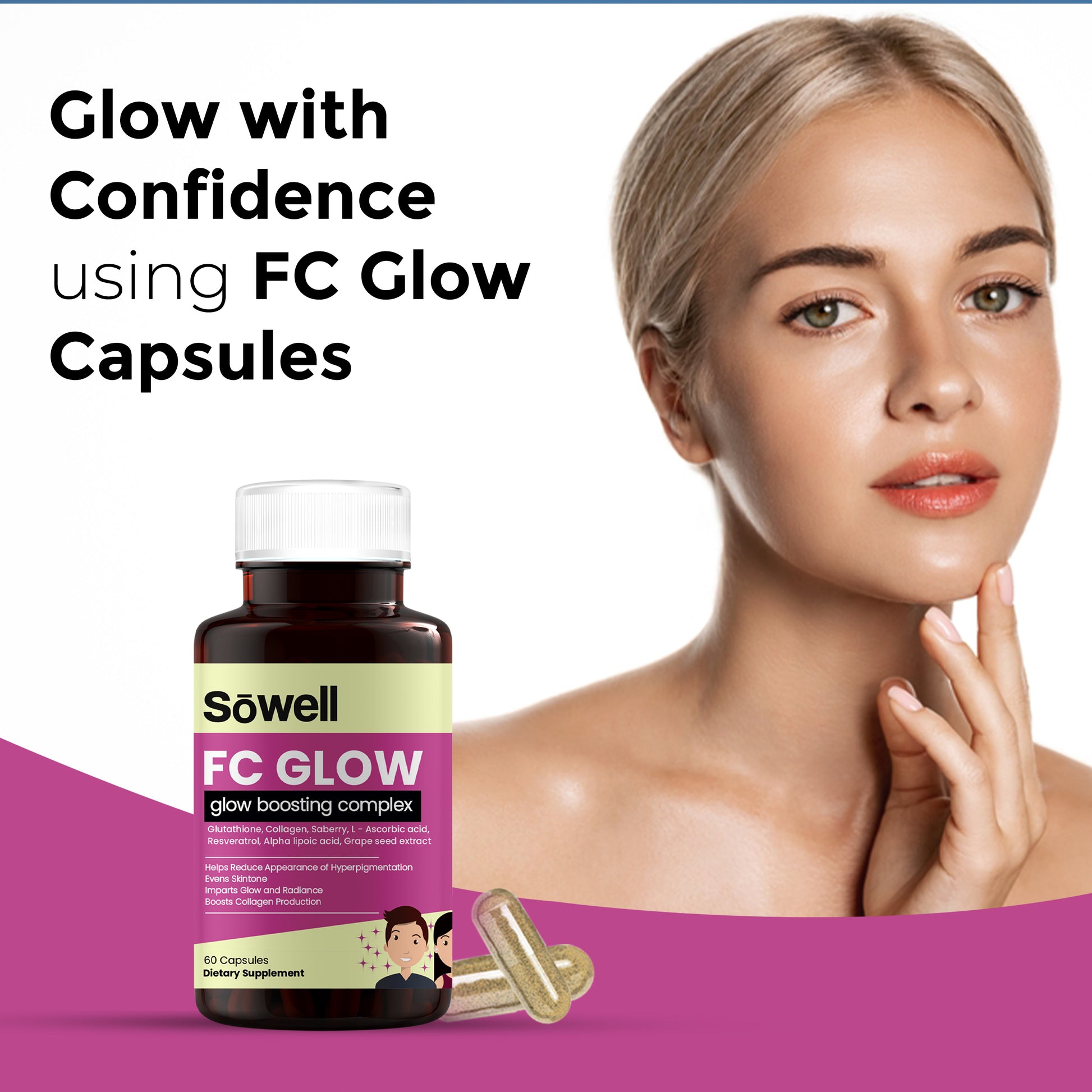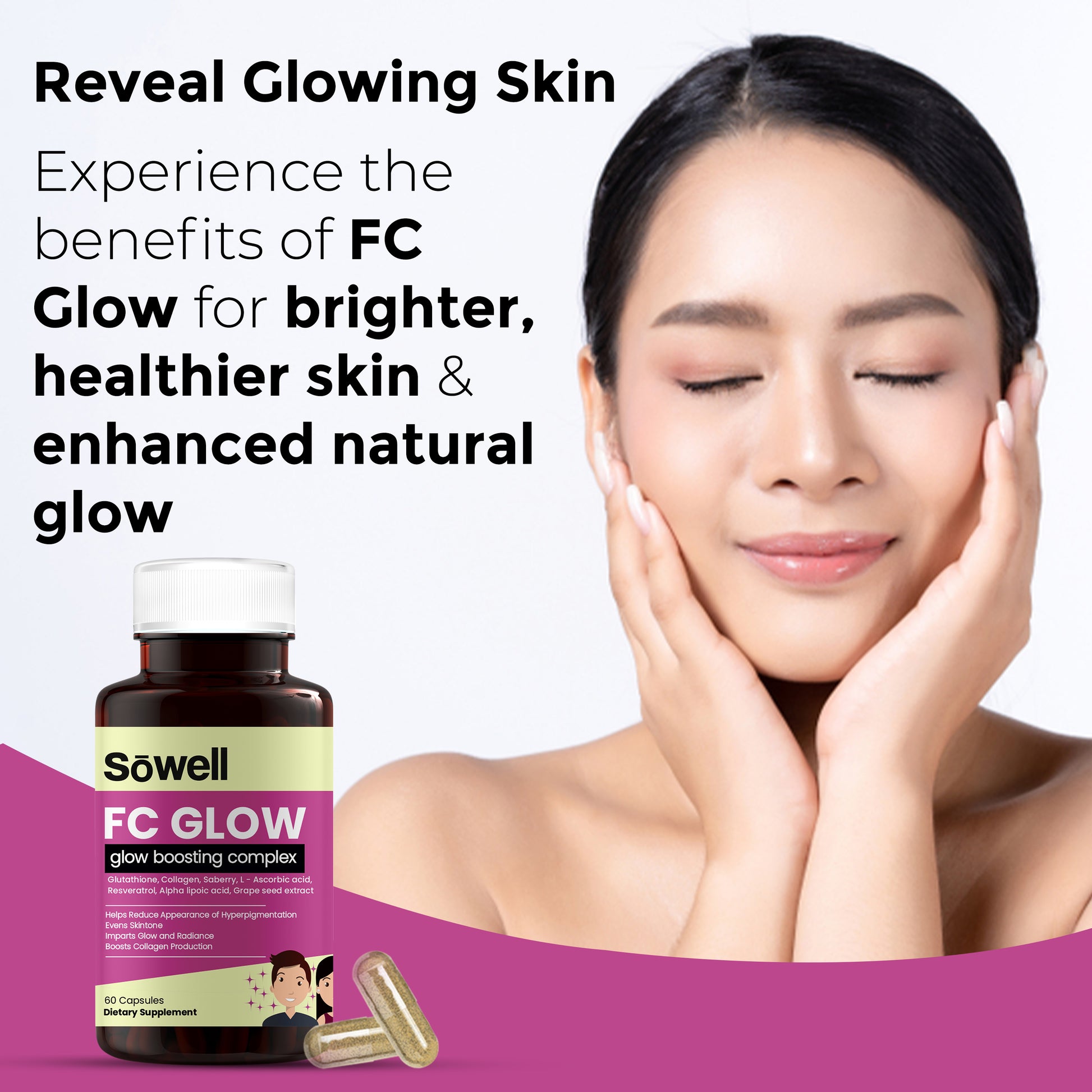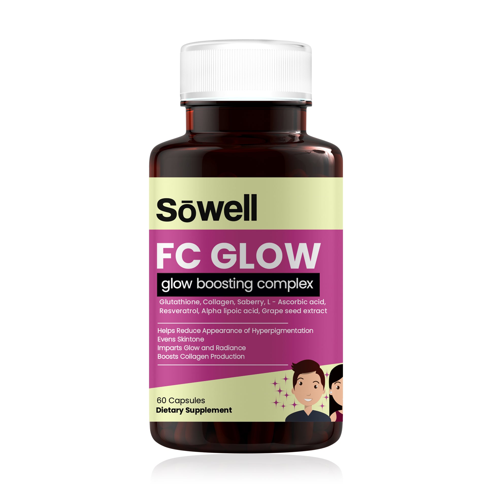Sowell Health FC Glow Capsules provide a comprehensive blend of skin-nourishing ingredients in a high-quality formula designed to enhance skin health and radiance. The capsules are free from artificial additives and preservatives, ensuring a pure and effective supplement. Our unique formulation combines antioxidants, hydration agents, and collagen to support a glowing and youthful complexion.