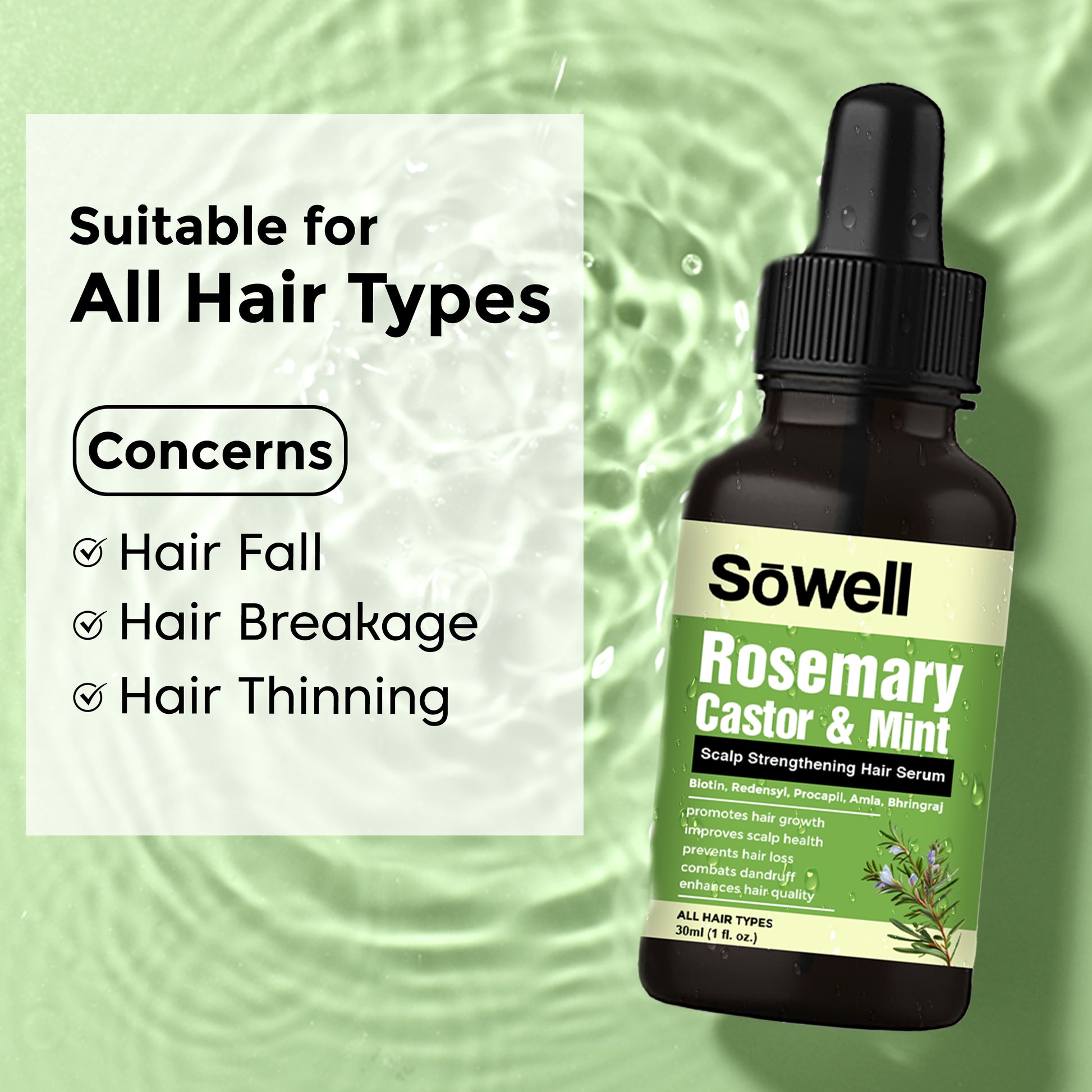 SOWELL ROSEMARY CASTOR & MINT Scalp Strengthening Hair Serum nourishes the scalp, strengthens hair roots, and promotes healthier, thicker hair growth. Formulated to revitalize and soothe, it helps create a stronger foundation for resilient, vibrant hair.