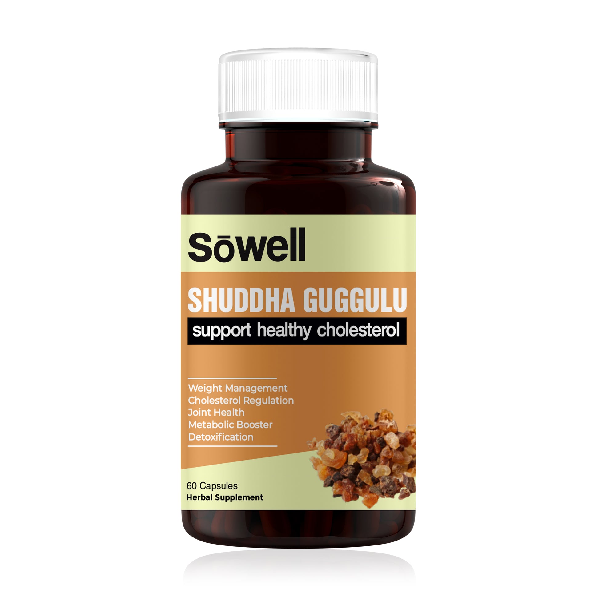Sowell Health Shuddha Guggulu Capsules are crafted with pure, standardized Shuddha Guggulu extract, ensuring maximum potency and efficacy. Our formula is designed to support cholesterol management, weight control, joint health, and overall detoxification. Free from artificial additives, our capsules provide a natural and effective way to enhance your health.